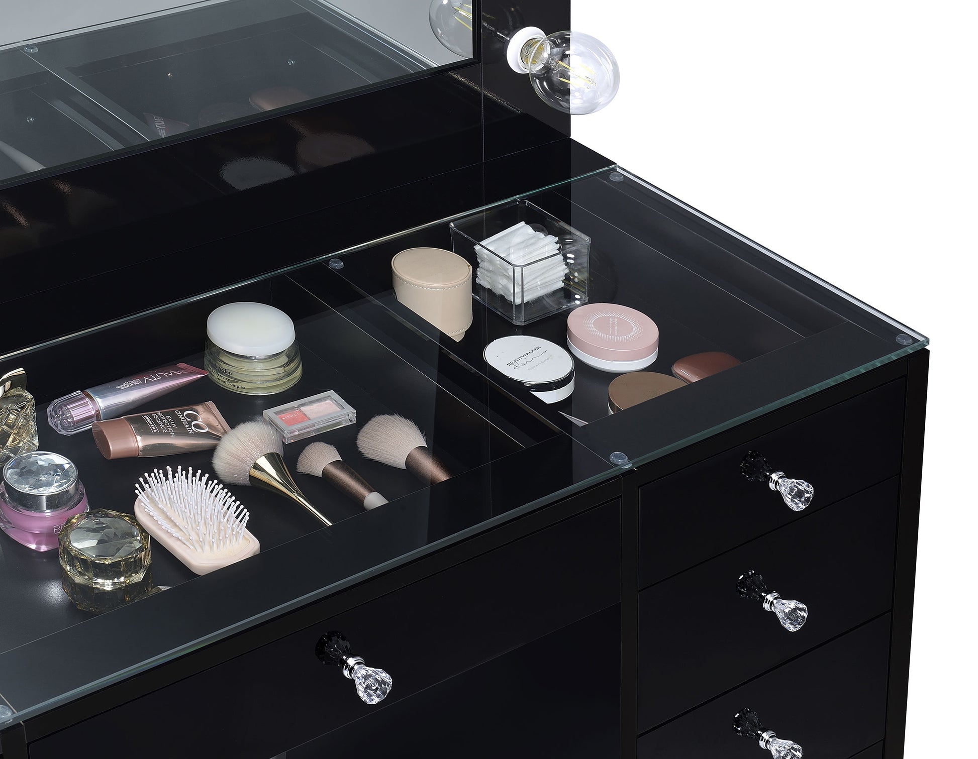 Create space for all your makeup, skincare and hair needs with this contemporary lighted vanity table and mirror. A sleek, fresh look, it boasts a glass top that allows you to see items placed in top drawers. Seven drawers total create easy opportunity for organization of all your products. A cabinet adds adjustable shelving for larger items. The mirror is lighted on three sides, offering multi-directional illumination for even lighting as you apply makeup or fix your hair.
