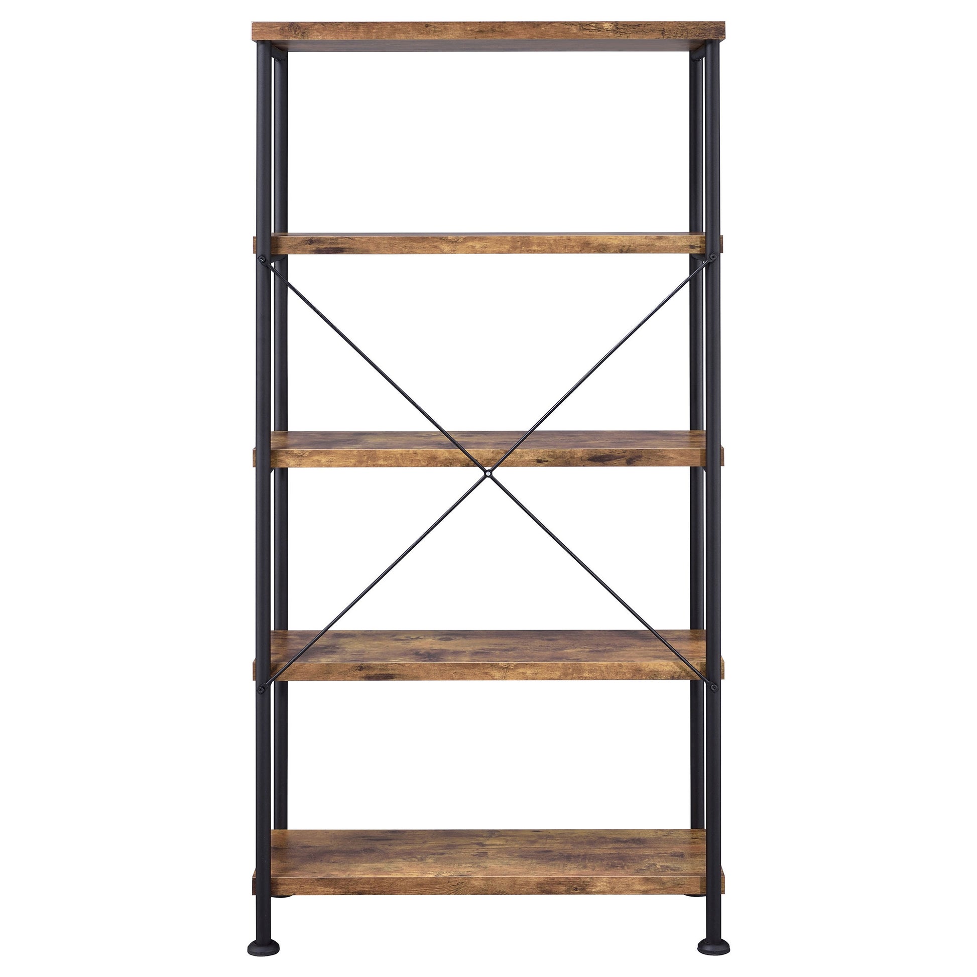 Keep important books handy with this eye-catching bookcase. Styled in an industrial motif, it blends antique nutmeg finish shelving with steel supports finished in black. Find plenty of space to store books and display accent decor. Place in a living room or family room as casual companion furniture. Four shelves and a top surface render this tall bookcase a perfect accent for an office or bedroom.