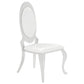 Bold, modern and inspired by Art Deco decor, this round five-piece dining set a statement-making addition to your dining room. The tabletop is incredibly crafted with real black marble, which makes an eye-catching statement against the mosaic shell tiles apron. The ornately carved table base is finished in chrome and plays off of the cabriole style legs of the four dining chairs. Each dining chair is armless in design and features sensationally soft creamy white leatherette fabric to contrast the tabletop. Choose this modern and Art Deco style dining set that serves as a work of art in your home.