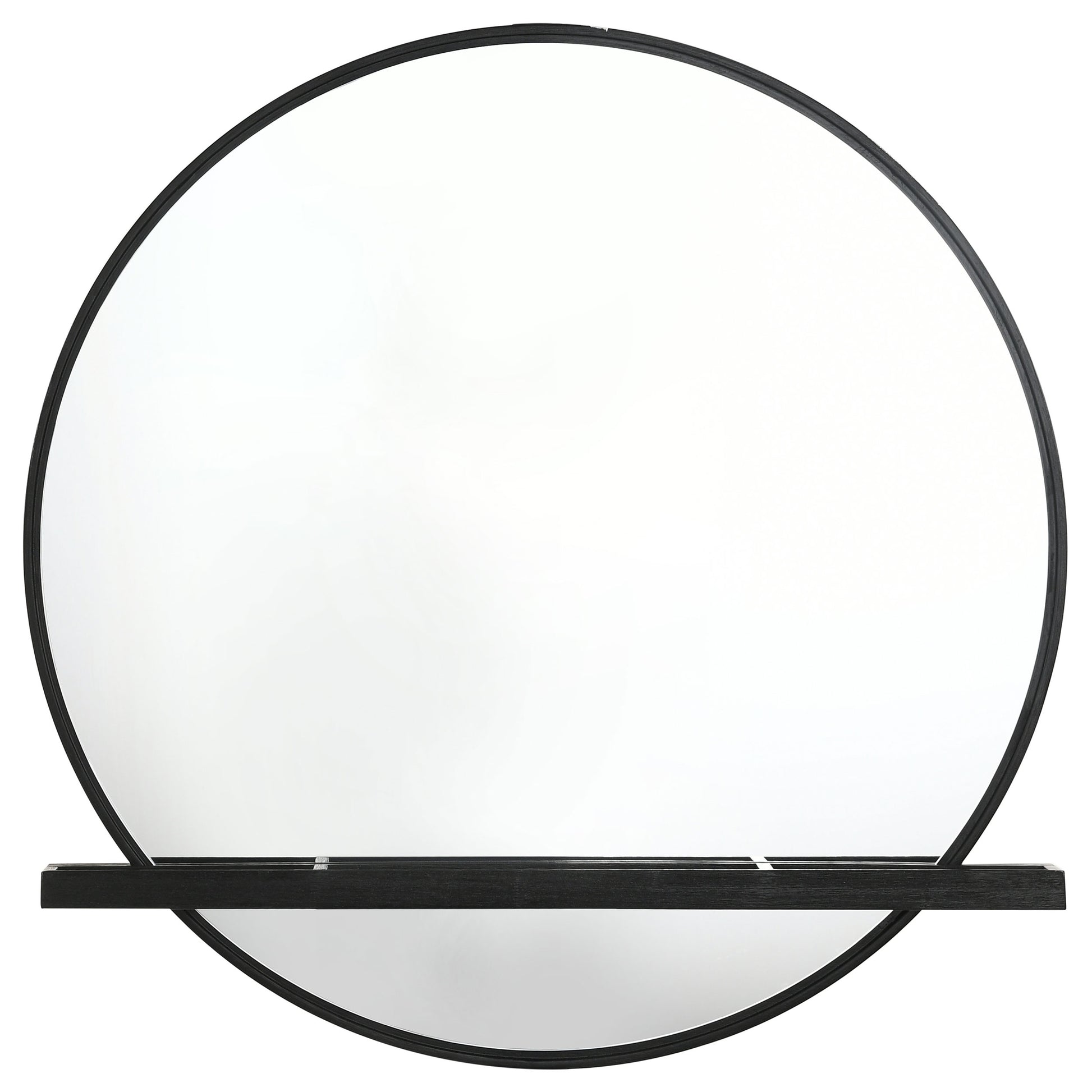 Complete your bedroom or dressing area with a modern round wall mirror. Great over your dresser or alone, the mirror features a crisp black frame finish. Its round profile includes flat glass, with a jewelry tray built in. The tray crosses horizontally low on the mirror and includes three recessed trays perfect for holding jewelry pieces, fragrance bottles and even prestige cosmetics or decor. Its black finish is neutral and versatile, adding cohesion to the matching bedroom pieces or standing alone beautifully.
