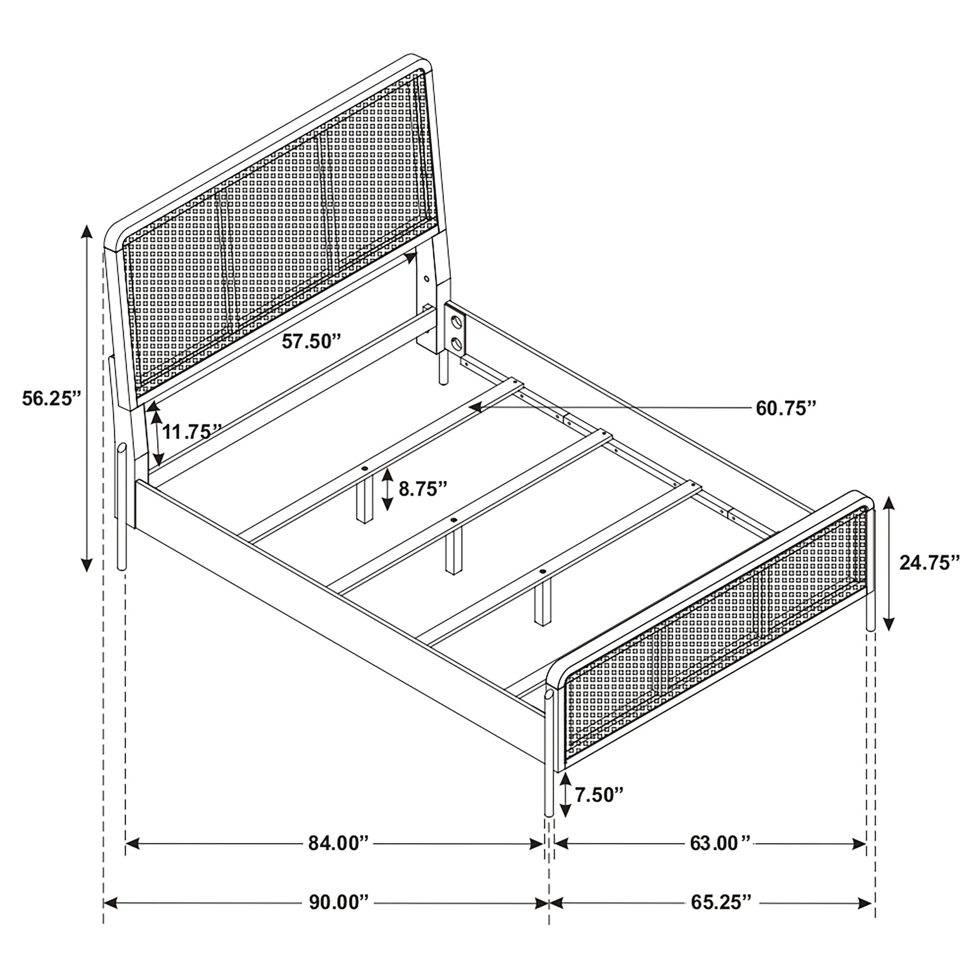 • Queen bed crafted with woven natural cane panels for organic mid-century appeal