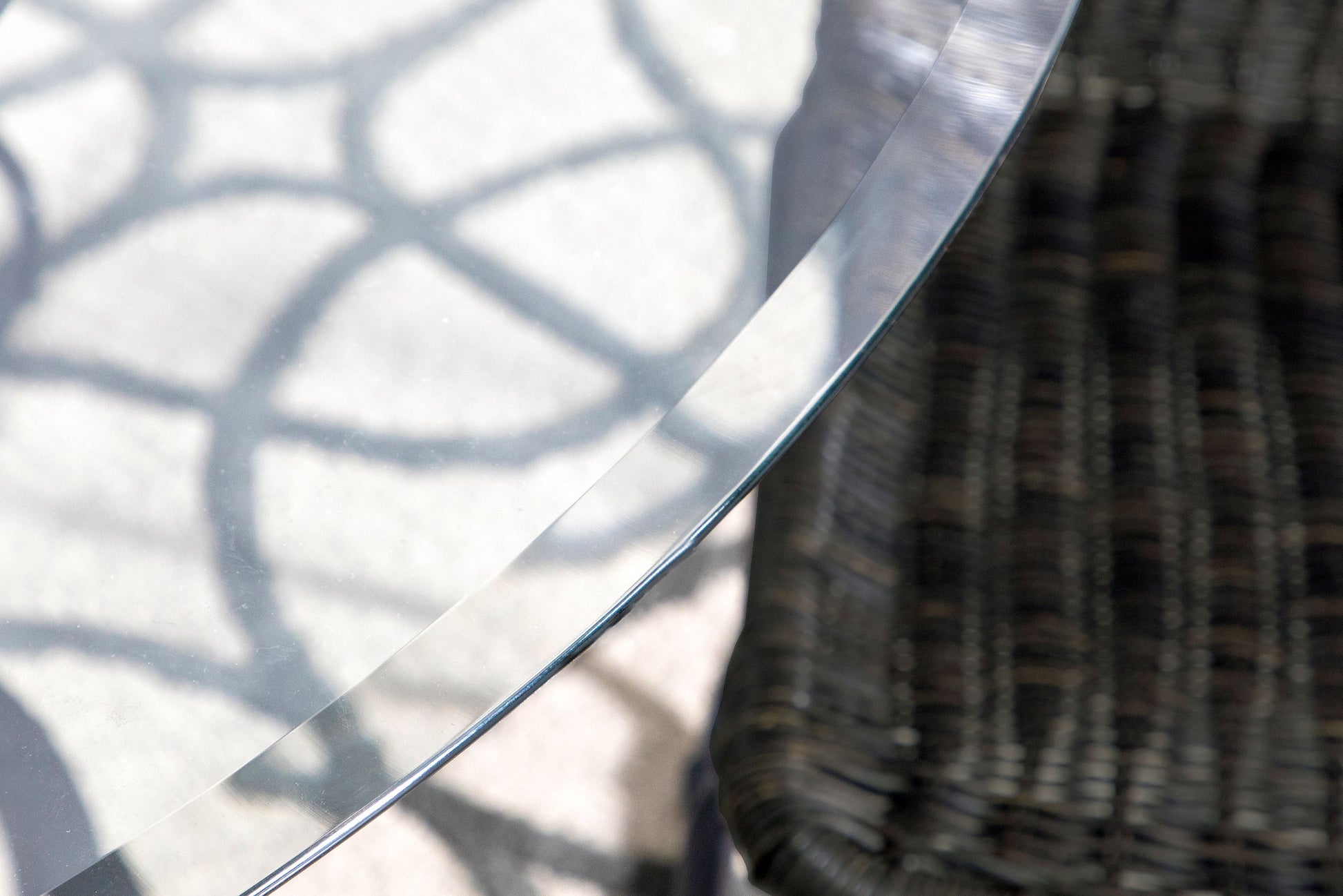 • A meticulously crafted metal table base with elegant curvaceous legs converging around an interlocking ring waist, crowned with a 6mm 48" diameter clear tempered glass