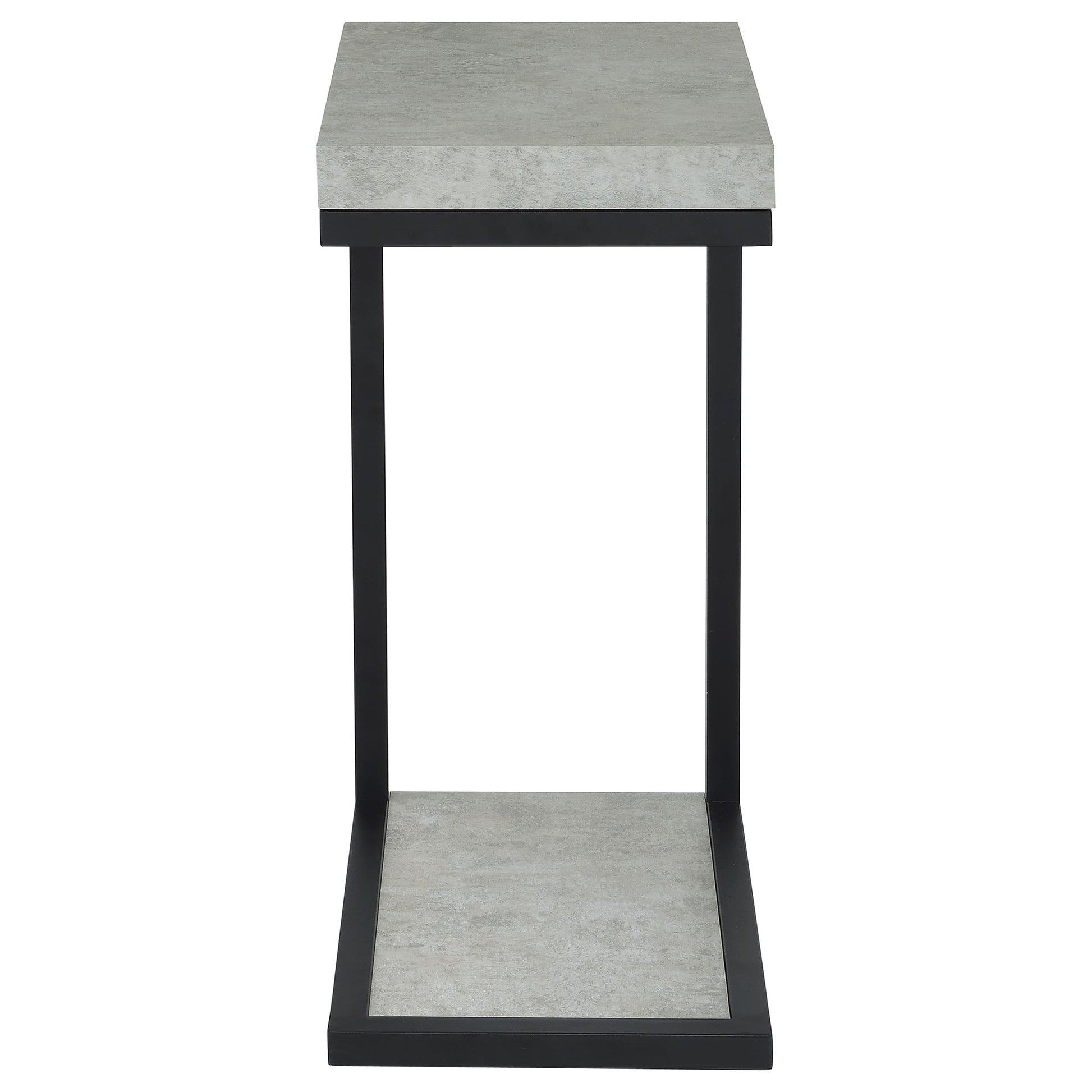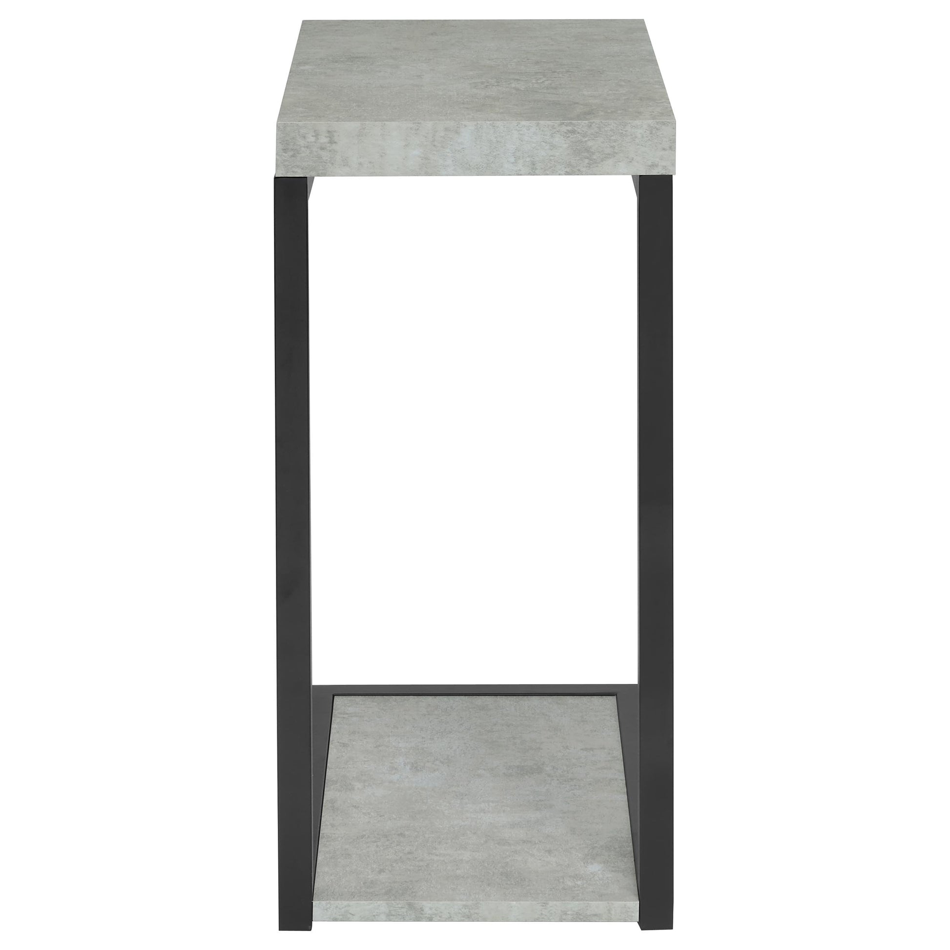 This modern side table combines industrial style with practicality, featuring an engineered wood top and base in a sleek cement-like finish. Its minimalist metal frame is coated in a durable black powder-coated finish, offering both strength and contemporary appeal. Perfect for small spaces, this end table provides functionality while maintaining a clean, open design that easily pairs with a variety of living room decor.