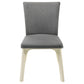 • Side chairs are constructed with X seat bases and feature soft gray upholstery over cushions