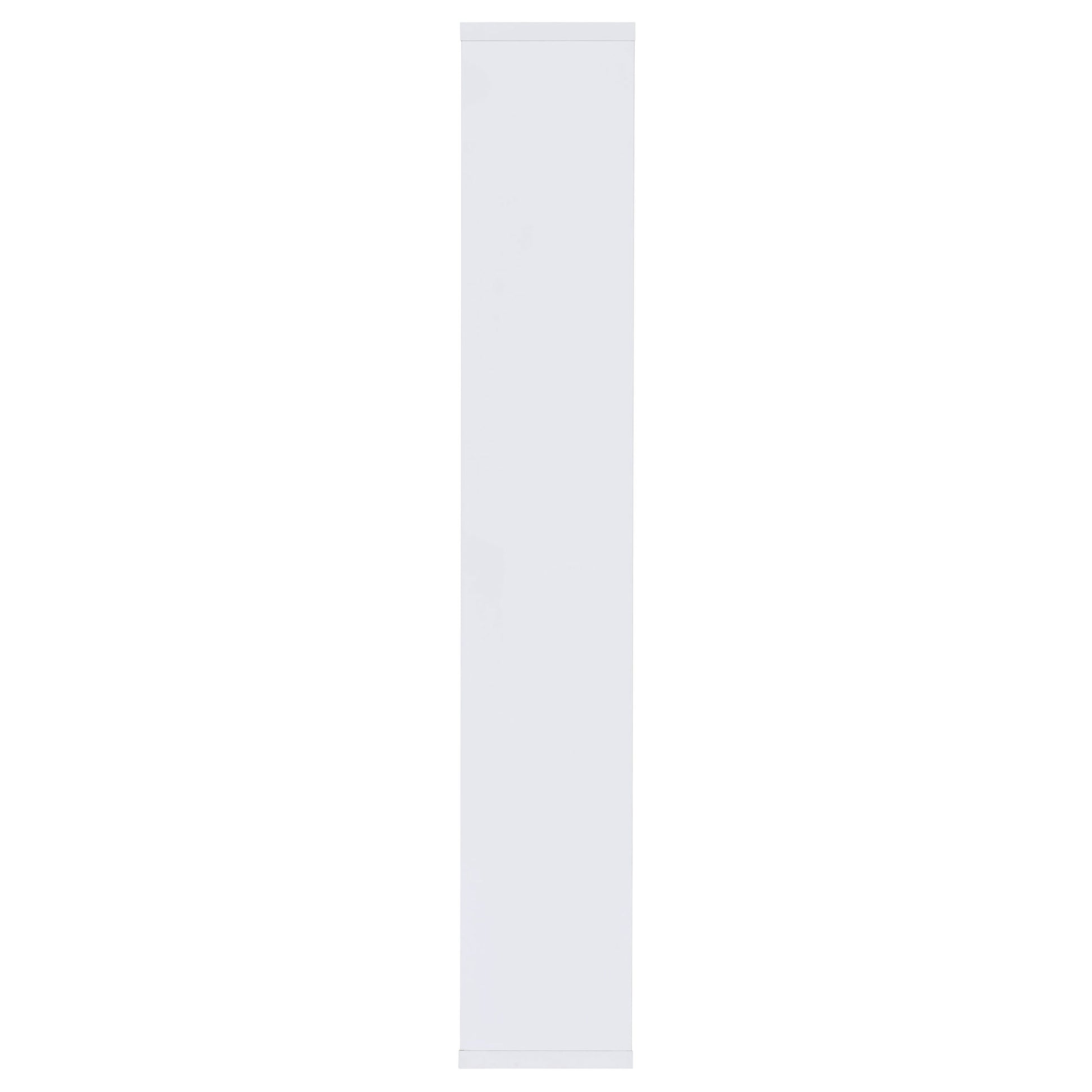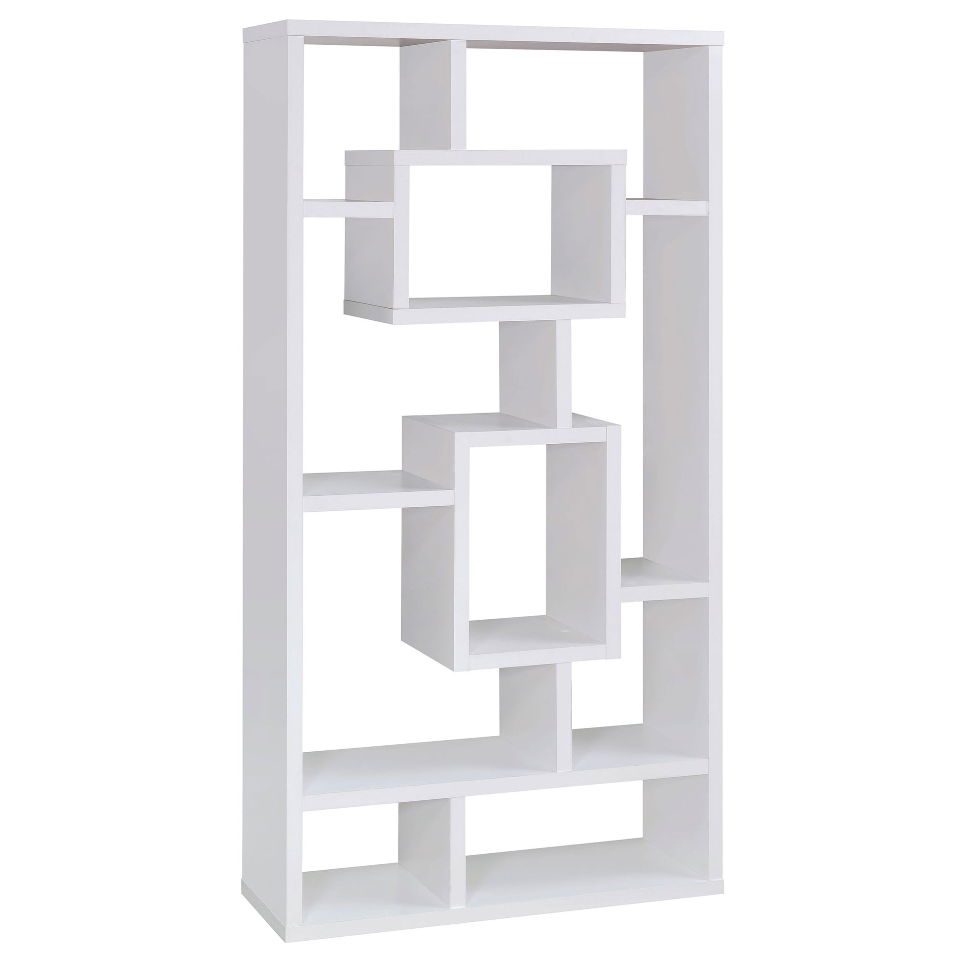 Put your most cherished memories on proud display. This bold bookcase features ten shelves of various sizes to show off your favorite keepsakes. With expert craftsmanship and high-quality materials, it provides safe, sturdy storage. Its cool, contemporary silhouette adds artsy appeal to a room with its striking, geometric shapes. This bookcase is available in white, cappuccino, or weathered grey for a variety of options to fit any decor.