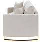 Opulent materials provide optimal comfort in this lush loveseat. It's crafted with kiln-dried solid pine wood, velvet, and foam and features accent pillows for added style and comfort. Reversible cushioned feather blend seat backs offer soothing comfort after a long day. Elegant beige fabric upholstery stands out even more against the sturdy stainless steel legs with lustrous gold accents. You'll love the style and cozy comfort of this elegant loveseat in your living room or den.