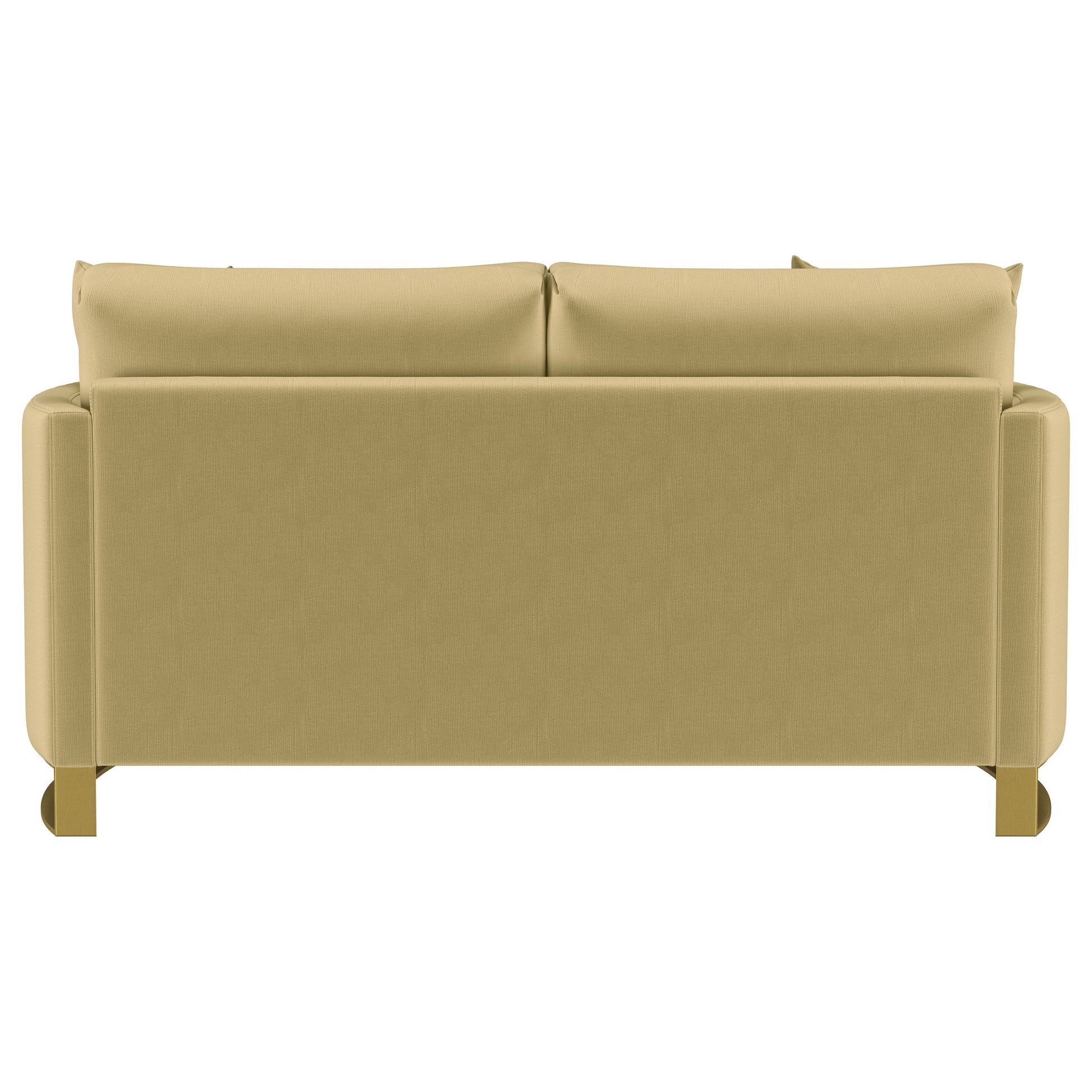 Indulge in opulent comfort with this textured velvet loveseat. Its reversible feather blend seat and back cushions, complemented by curved arms and gold stainless steel legs. Smooth upholstery and lustrous details blend simplicity with timeless splendor, making this piece a perfect focal point for refined interiors. With its inviting profile and graceful presence, it elevates both style and relaxation.