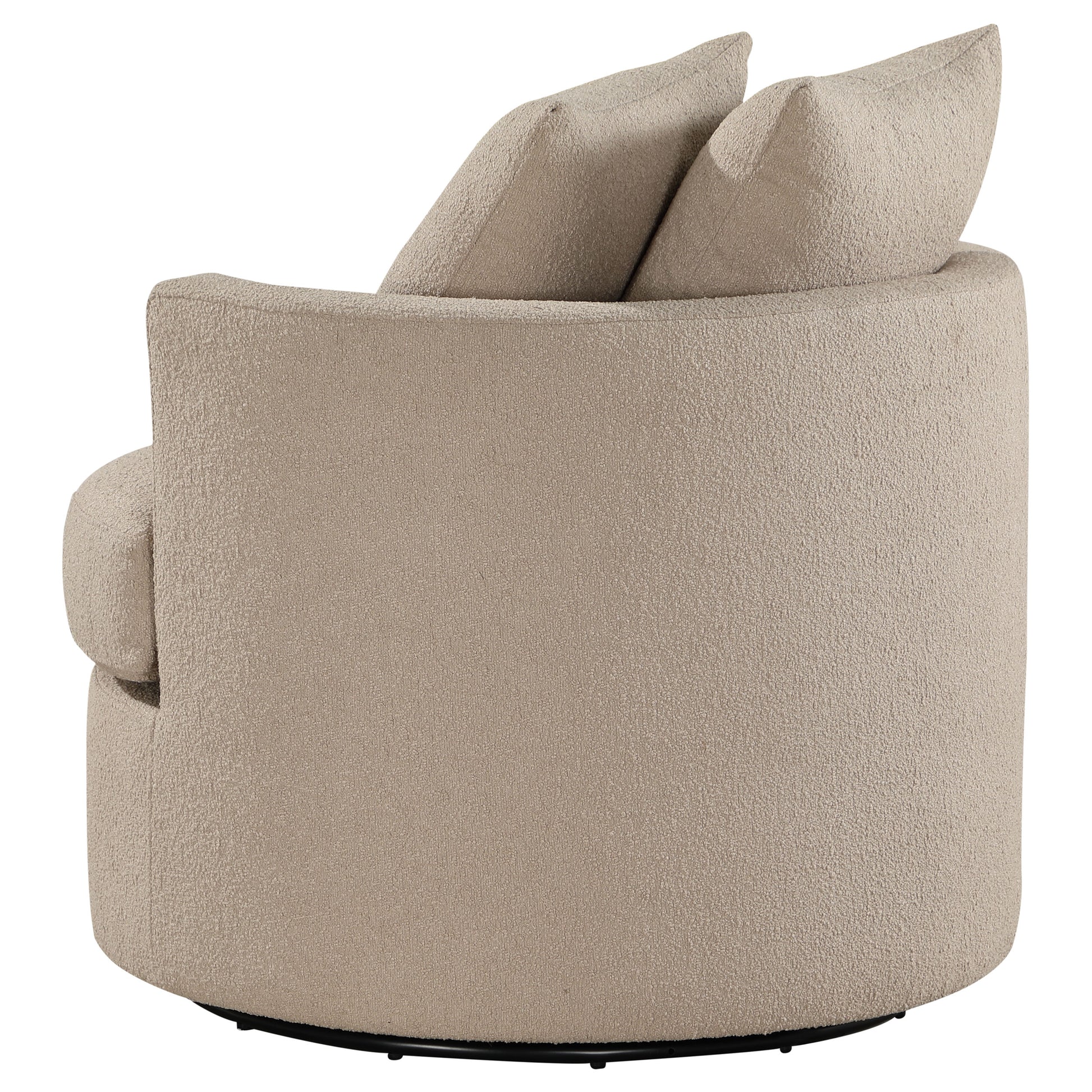 Capture the essence of stylish versatility with a modern swivel accent chair. Perfect for living room or den, it's a compact silhouette with a round frame and pocket coil springs in its foam seat cushion, creating incredible comfort for lounging or entertaining. The chair features a swivel base, adding easy movement and making it a lovely choice for a multi-functional space. Its rounded backrest includes foam cushioning and is complemented with a pair of pillows that bring softness to the overall presentation. Its warm upholstery sets the tone for your space and serves as a stylish neutral to complement surrounding decor choices.
