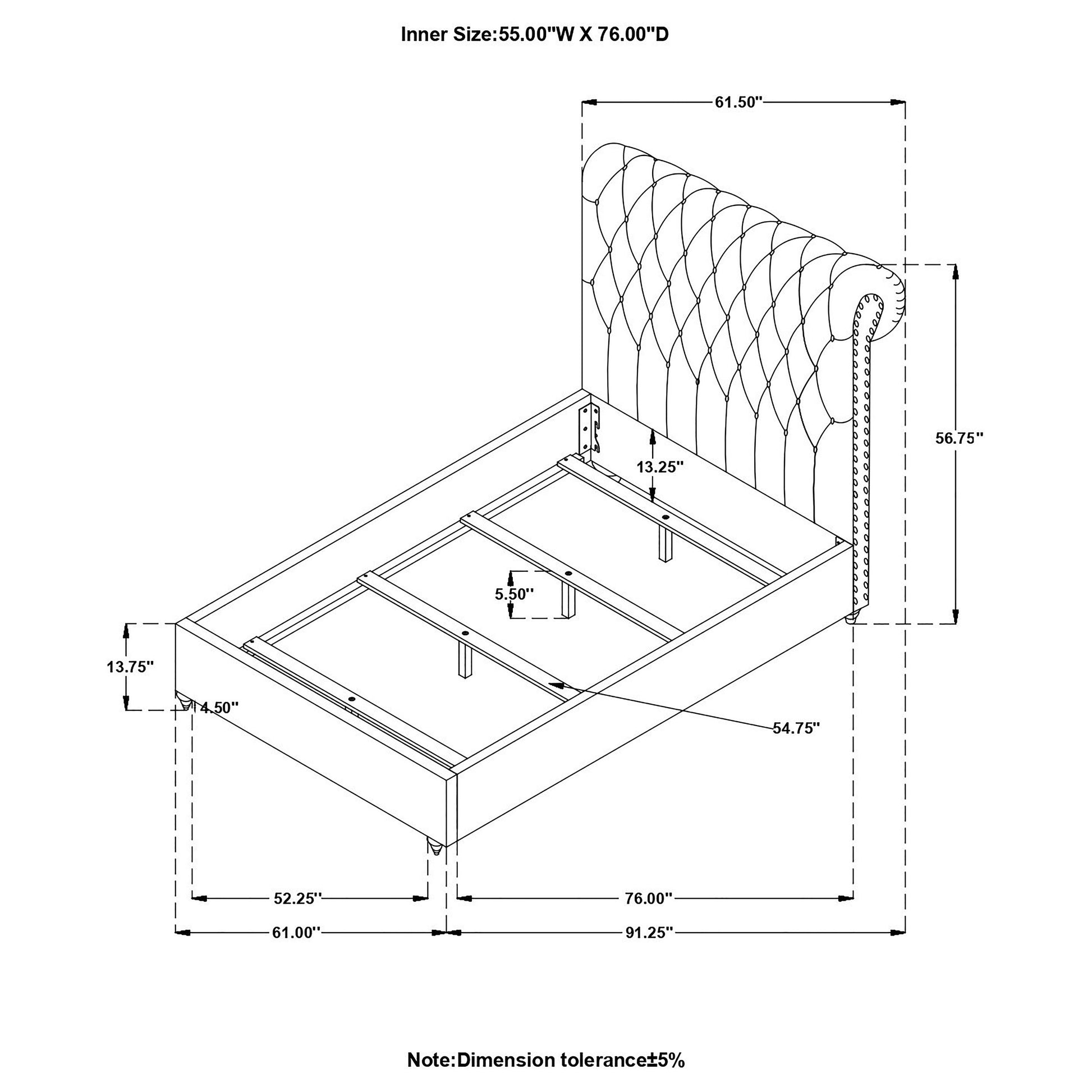 • Upholstered Chesterfield-inspired full bed frame with timeless tufted headboard
