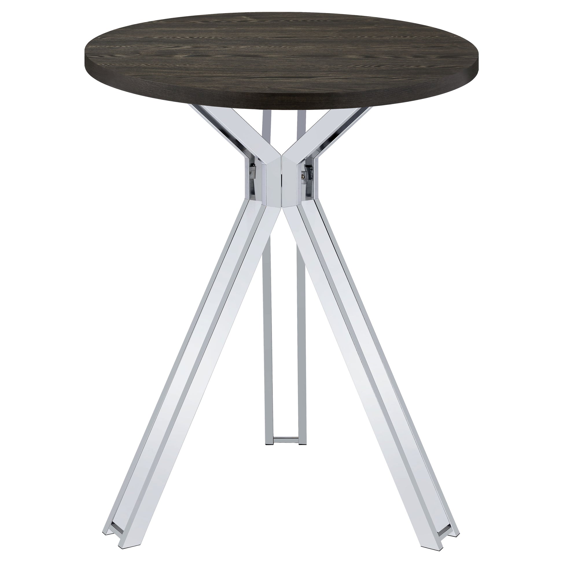 Gather around this sleek rustic-inspired contemporary bar table to wet your whistle. Designed with a wonderful contrast of woodsy and metallic elements, this beautiful modern bar table takes a masculine approach fit for game nights and beyond. Stand around with a drink in hand or coordinate with the bar stool of your choosing, talking over the charming, round, dark oak table top. Edgy polished chrome legs present an hourglass-like pedestal base for a dramatic, yet elegant touch. Set this inviting bar table in a casual entertainment room for a metallic accent and barrel-like element of surprise.