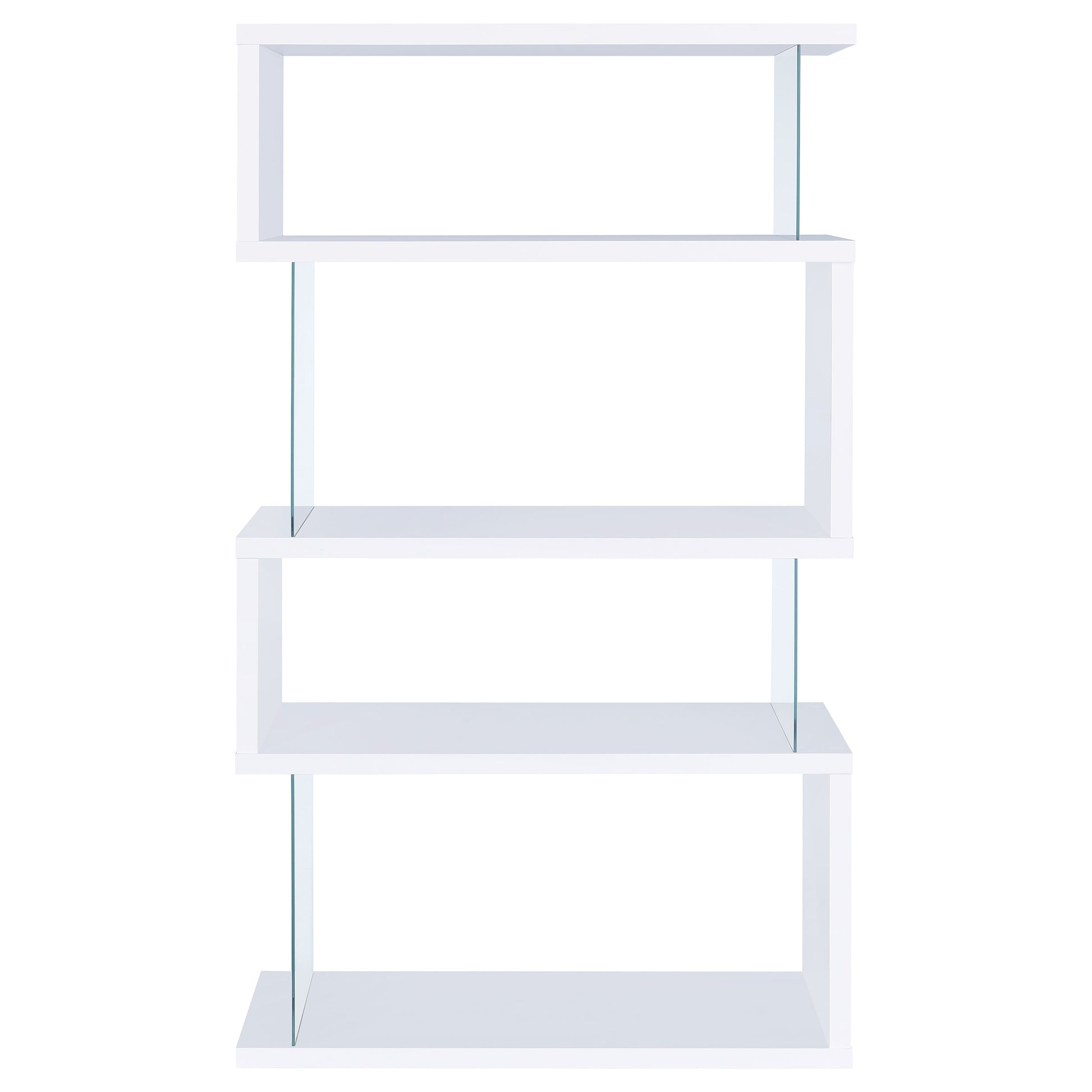 Creatively crafted, this bookcase enhances the modern aesthetic of any home. Its shelves are arranged in an eye-catching, zig-zag design, adding contemporary charm. Its silhouette is accentuated by clear tempered glass panels to complete its chic, trendy look. Expert craftsmanship and top quality materials lend strength and durability. It's available in four finishes, giving you attractive options to match your home decor.