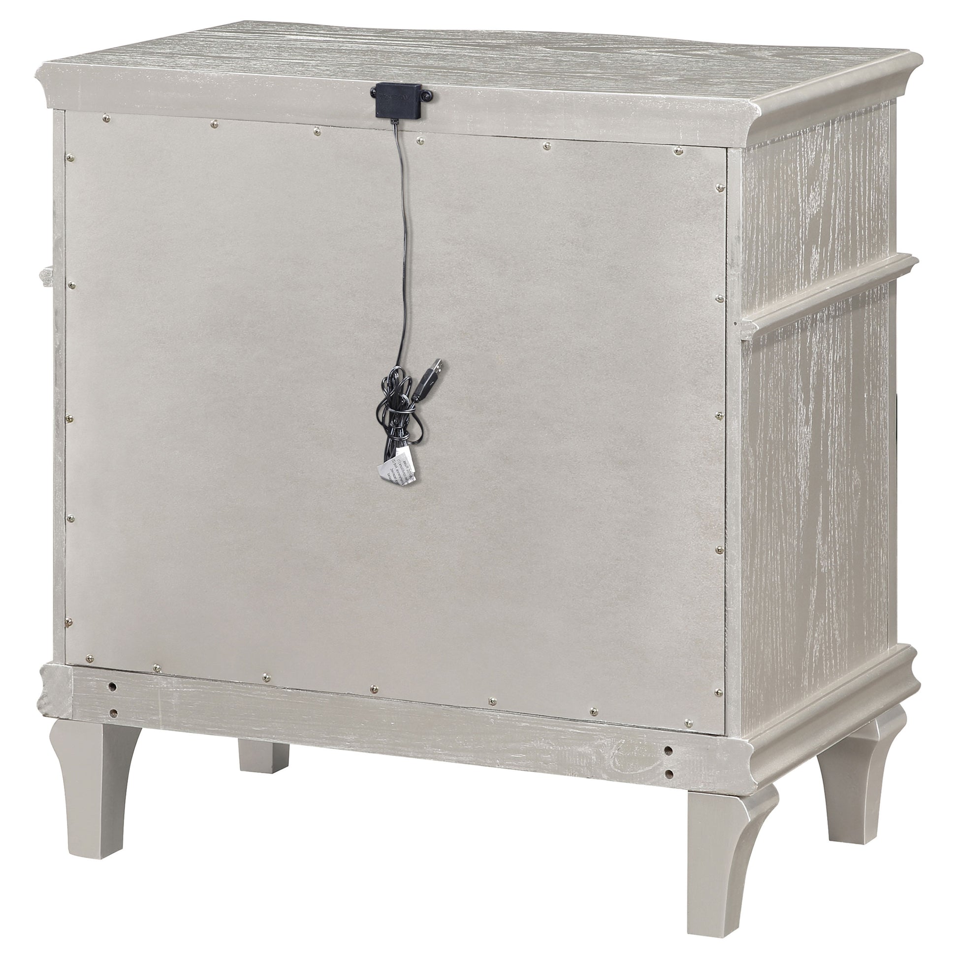 Keep all your bedroom essentials and wardrobe items neatly organized with this glam three-drawer nightstand. A contoured frame design features sparkling side panels flanking the three spacious drawers for a luxurious touch. A silver oak finished wood frame is accented further by modern glam metal knobs and bail handles that help slide each drawer with ease. A soft grey felt-lined top drawer invites you to store more delicate items. A hidden USB outlet creates a convenient charging area for handheld devices.