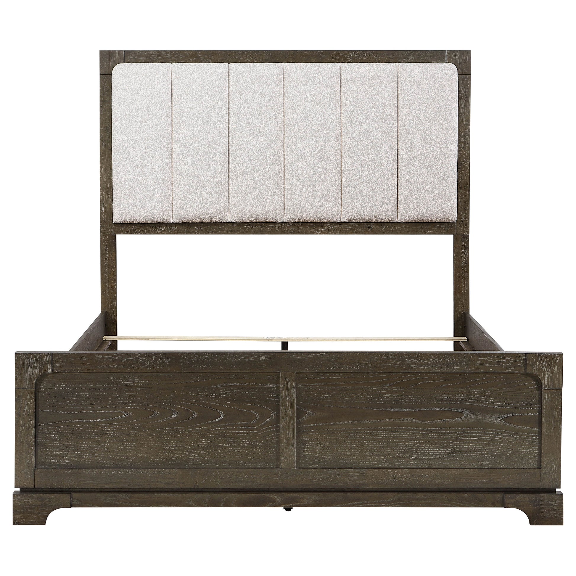 Transform your bedroom with this elegant panel bed featuring a 59-inch tall headboard upholstered in beige boucle fabric for a soft, textured appeal. The dark cocoa wood finish highlights the natural grain, lending warmth and sophistication to the design. Crafted from rubberwood, engineered wood, and foam, this bed offers a durable and supportive structure. The classic panel design makes it a timeless and versatile centerpiece for your bedroom.