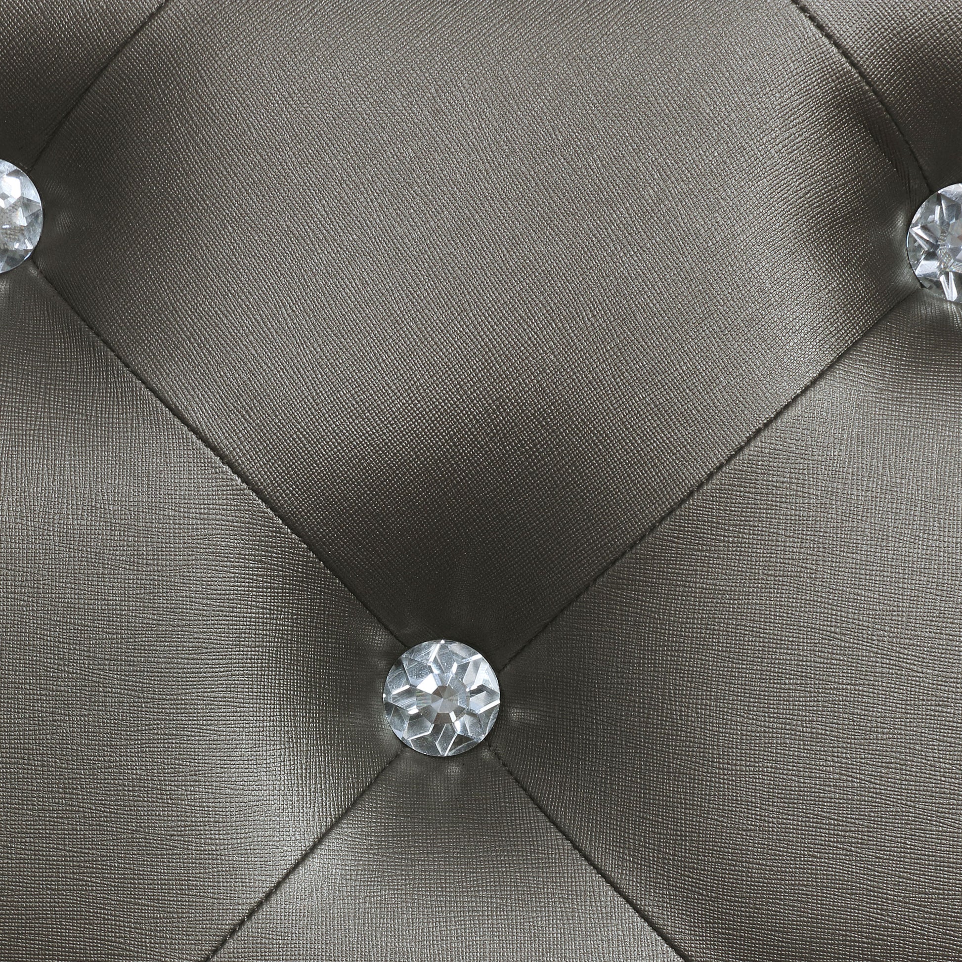 • Silver metallic finish pairs with mirrored trim and crystal hardware throughout