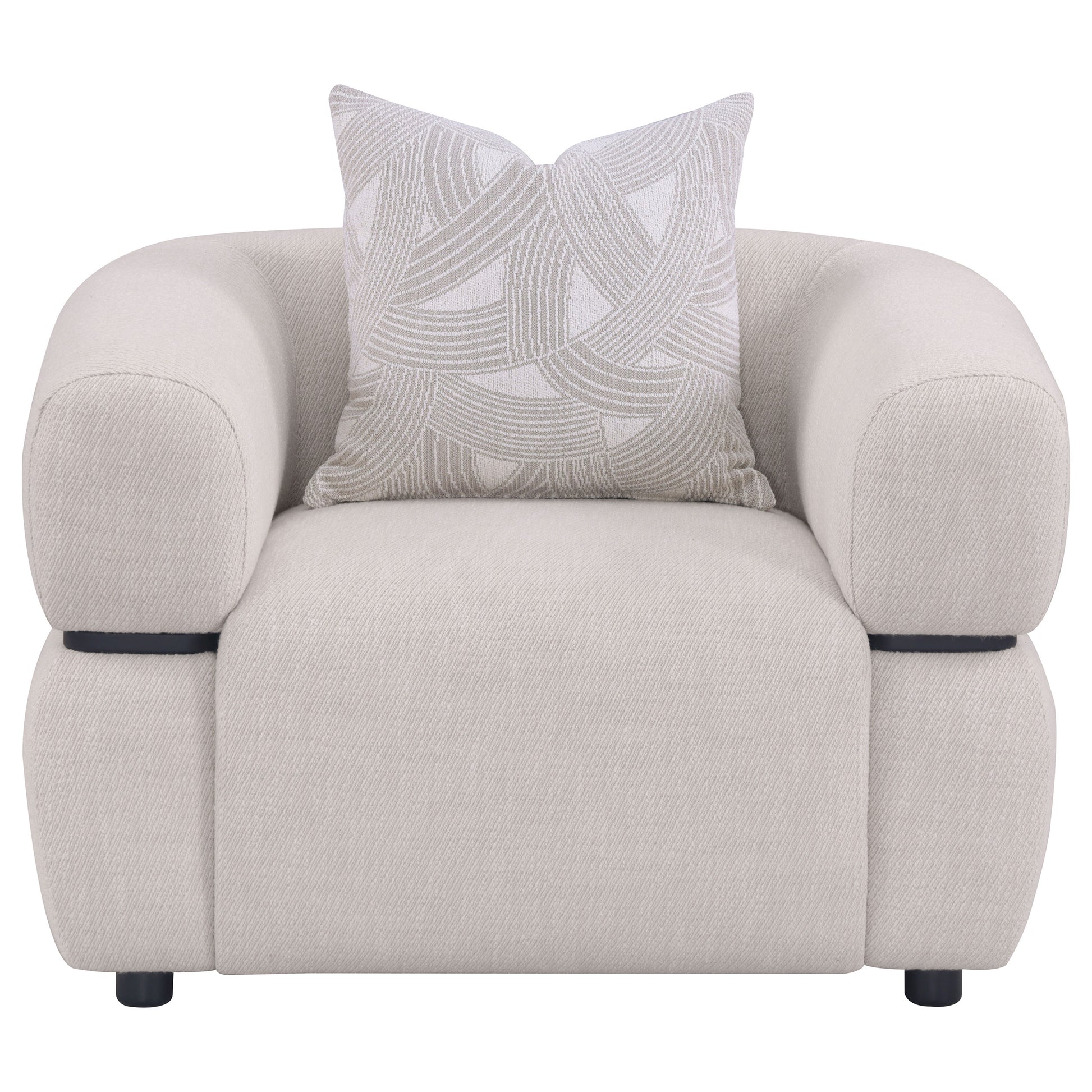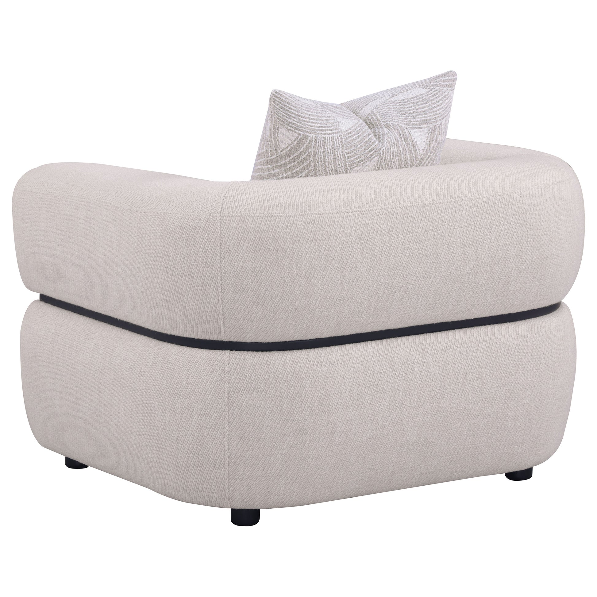 Sculptural in form yet grounded in comfort, this accent chair commands attention with its bold silhouette and plush detailing. Its wide, arched arms and thick waterfall seat are upholstered in textured fabric for a modern, tailored appeal. A distinctive solid wood waistband encircles the frame, while a down and pillow accents adds softness. With pocket coil support and refined shaping, it brings confident elegance to any living space.