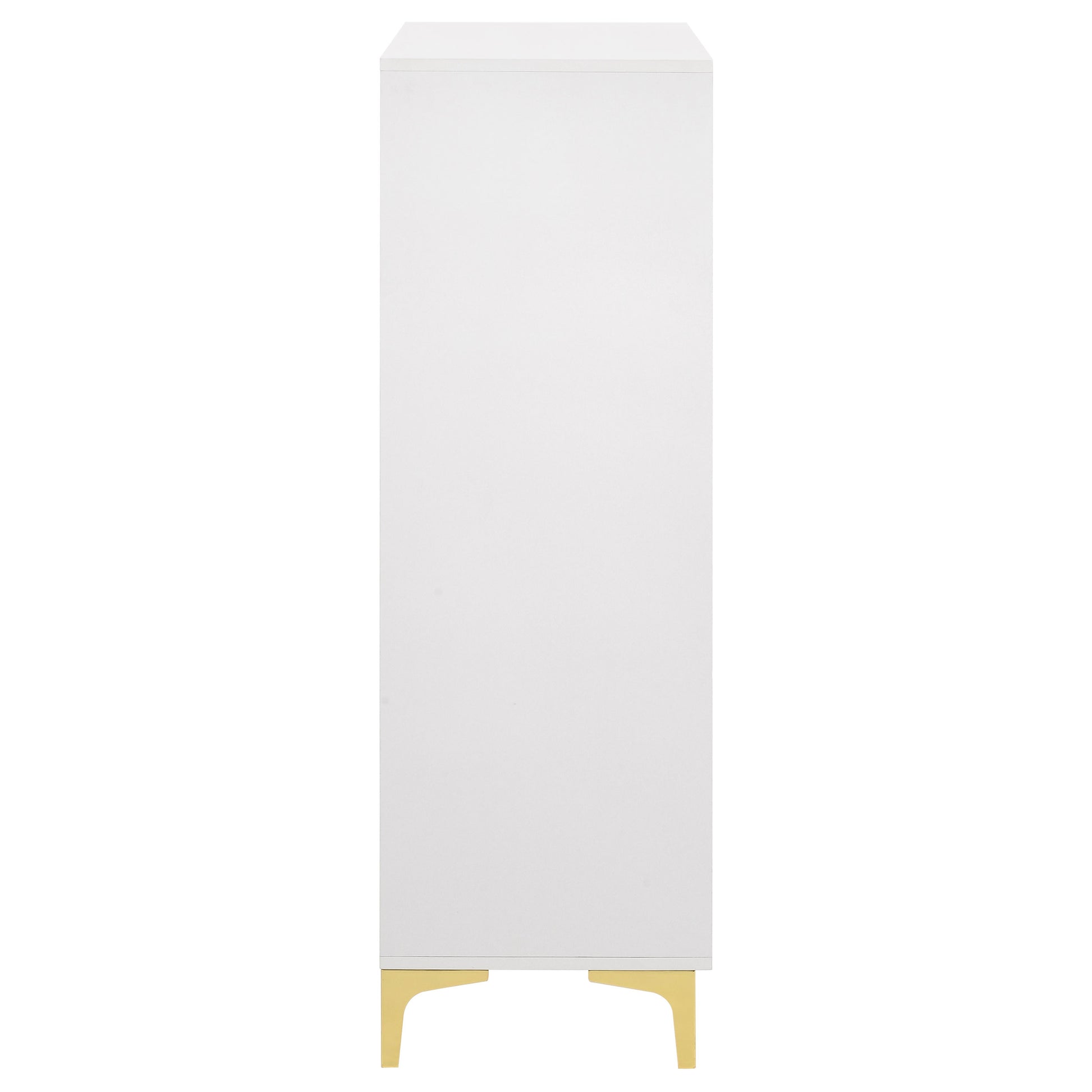 Open up your tight bedroom floor plan with this stately modern glam chest. Five spacious drawers stacked on top of one another keep garments and bedroom essentials stowed away and organized, helping you find what you need fast. A bright, white finish offers a sleek elegance, set off by warm golden accents. Along each of the five drawers is a slender gold finished pull, matched by the golden bracket legs that lift it up. Place this stunning five-drawer chest in your bedroom for an elegantly understated contemporary aesthetic.
