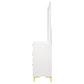 Brighten up your bedroom with the modern glam and cheer of this six-drawer dresser, a statement piece that brings a light and airy feel to contemporary spaces. Gold-finished pulls and bracket-style legs infuse the piece with a touch of luxury, while the crisp white finish keeps it sleek and dignified. Ideal for anchoring your focal wall or complementing a vanity area, this long and narrow dresser is a splendid addition. The accompanying contemporary mirror, framed in white, adds height and elegance, creating a formal vanity when placed atop the dresser.