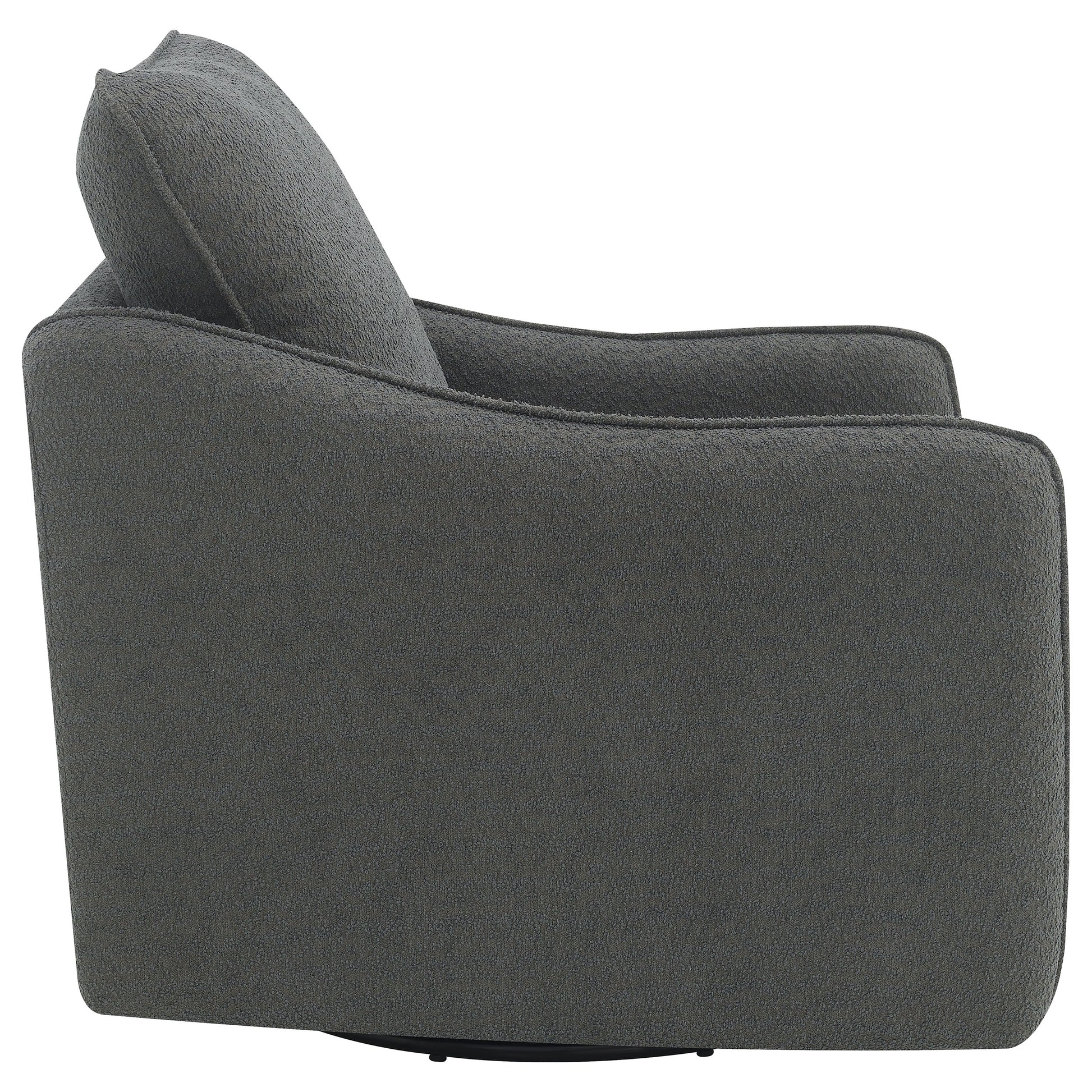 Nestled within the soft embrace of this bouclé upholstered chair, one finds a moment of tranquility. Its harmonious 360 swivel and glider functionality make each movement a fluid dance, a gentle invitation to unwind. The meticulously shaped arms, a testament to refined style, offer a restful perch for weary elbows. As the day's light fades, this chair becomes a cherished haven, its silhouette a blend of comfort and contemporary charm. In this cozy nook, time slows, and serenity takes a seat.