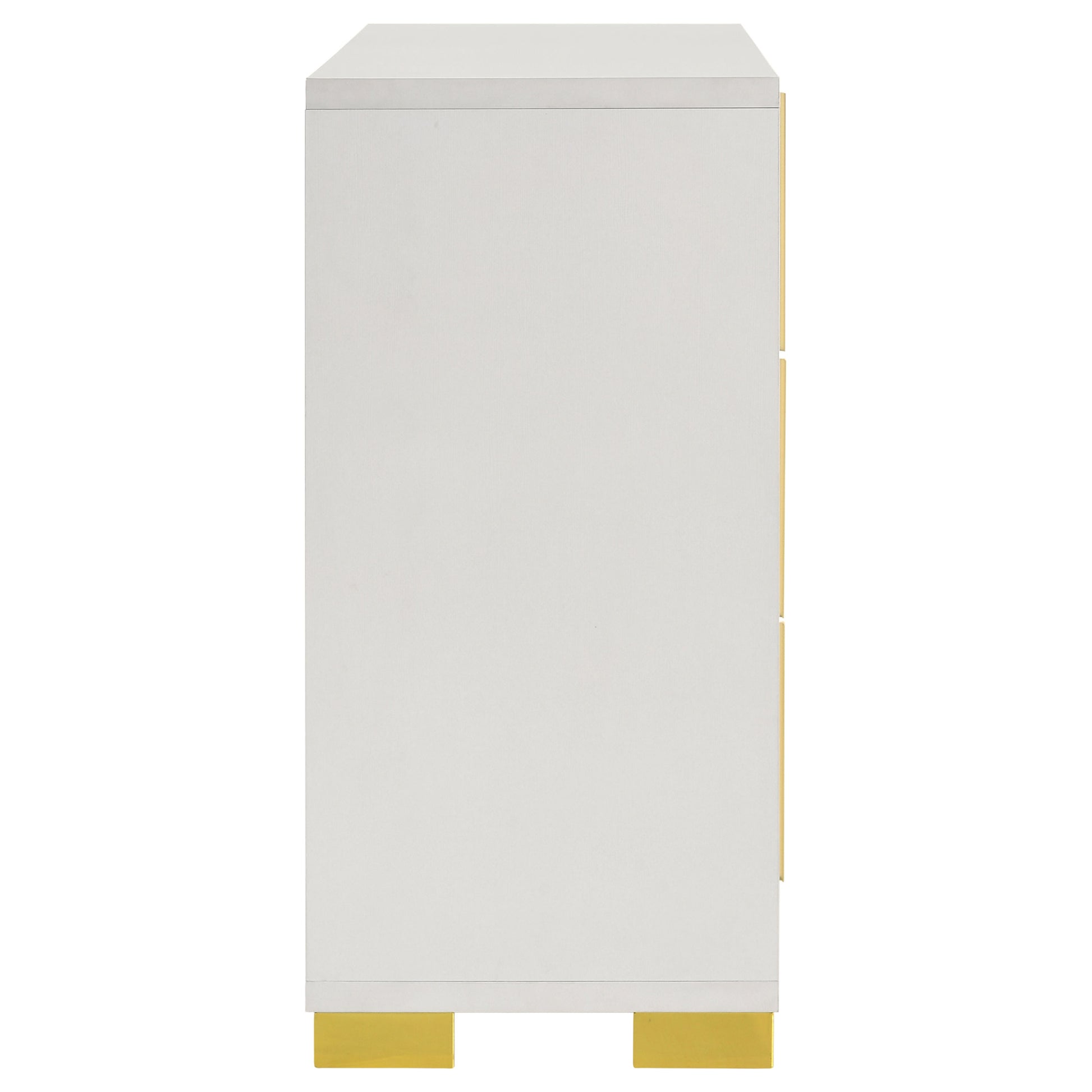 Soak up the sleek and simple yet compelling look of a six-drawer dresser with a dramatic aesthetic that changes the tone of your contemporary bedroom. Modern design details produce a chic vertical dresser with an Art Deco vibe and tons of storage space. Made of wood products, this six-drawer dresser features a versatile finish with glam accenting from gold finish metal, placed carefully to emphasize a geometric linear effect. Store incidentals and accessories in drawers operating smoothly on center metal glides. English dovetail drawer construction embellishes this dresser’s quality, as vertical gold metal drawer hardware offers a unique impact.