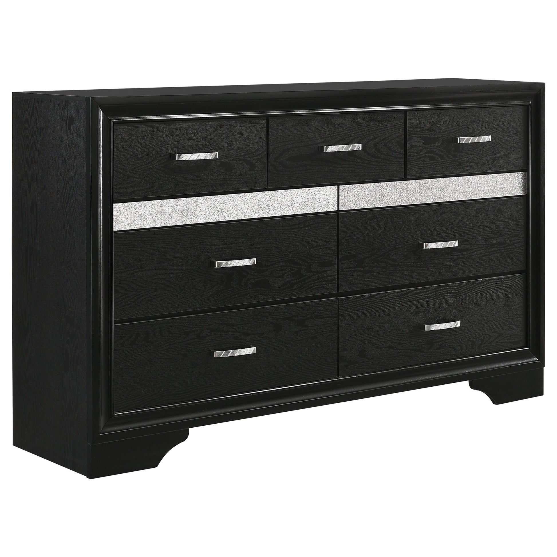 Sparkling trim brings the glamour of diamonds to this five-piece modern bedroom set. Designed to make a statement, it showcases a deep black finish with tuxedo inspired design elements that add glittering allure. The set centers on a chic bed, complete with an upholstered headboard and low footboard that create an airy, inviting pairing. The dresser, chest and nightstand each add ample storage, perfect for an organized bedroom ambiance. Each piece is complete with sparkling trim and jewelry inspired bar pulls on its drawer fronts that pull the look together perfectly.