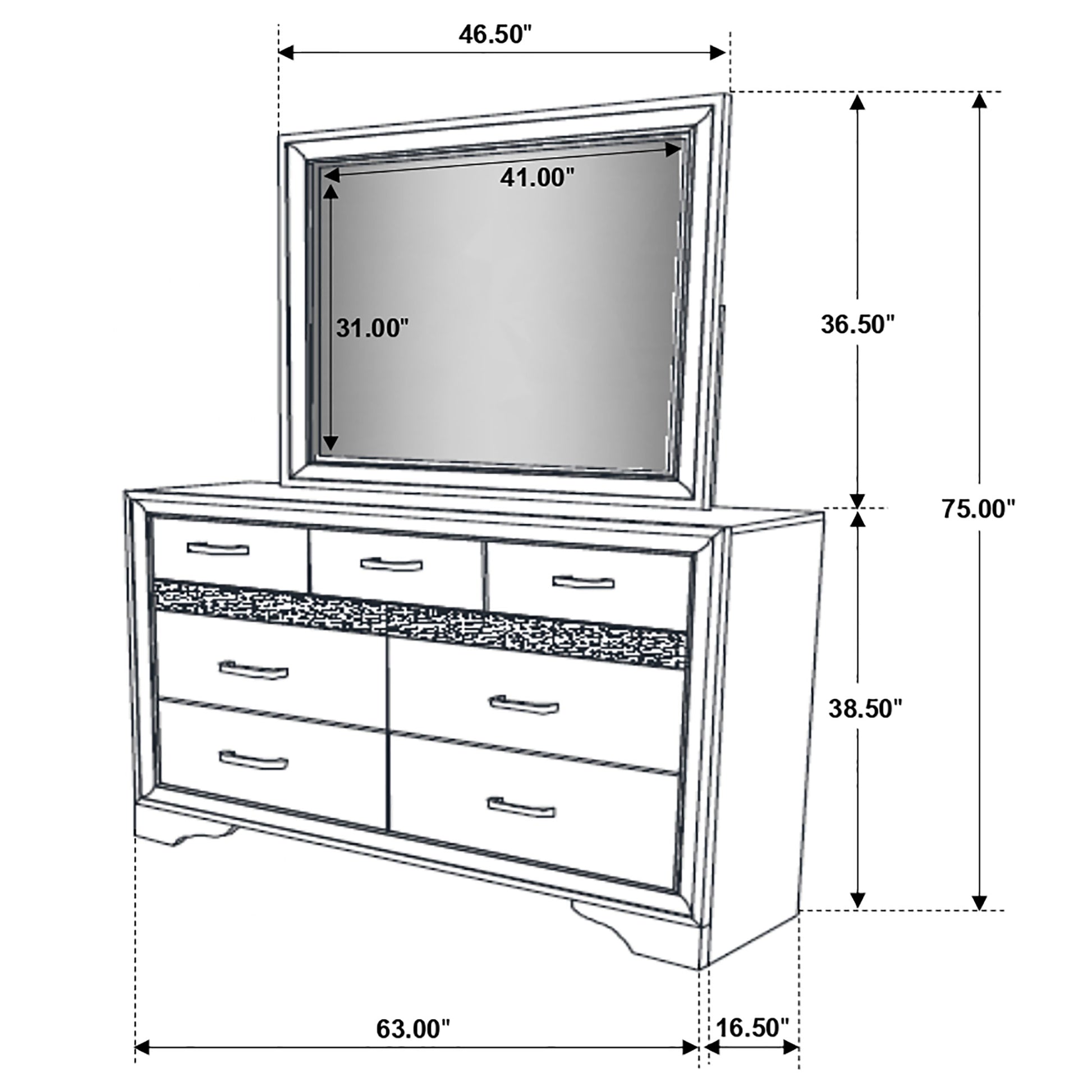 Elevate your bedroom with the chic and sophisticated grace of this dresser, featuring felt-lined drawers to keep your delicate belongings safe. The hidden jewelry drawer provides discreet storage for valuables, while the glittery front panel adds a touch of sparkling opulence. This beautiful dresser lends elegance to any space, complemented by the cheerful mirror with its linear, dimensional design. The framed construction of the mirror offers a stylish ambiance, and the choice of finishes allows you to tailor the look to your design scheme.