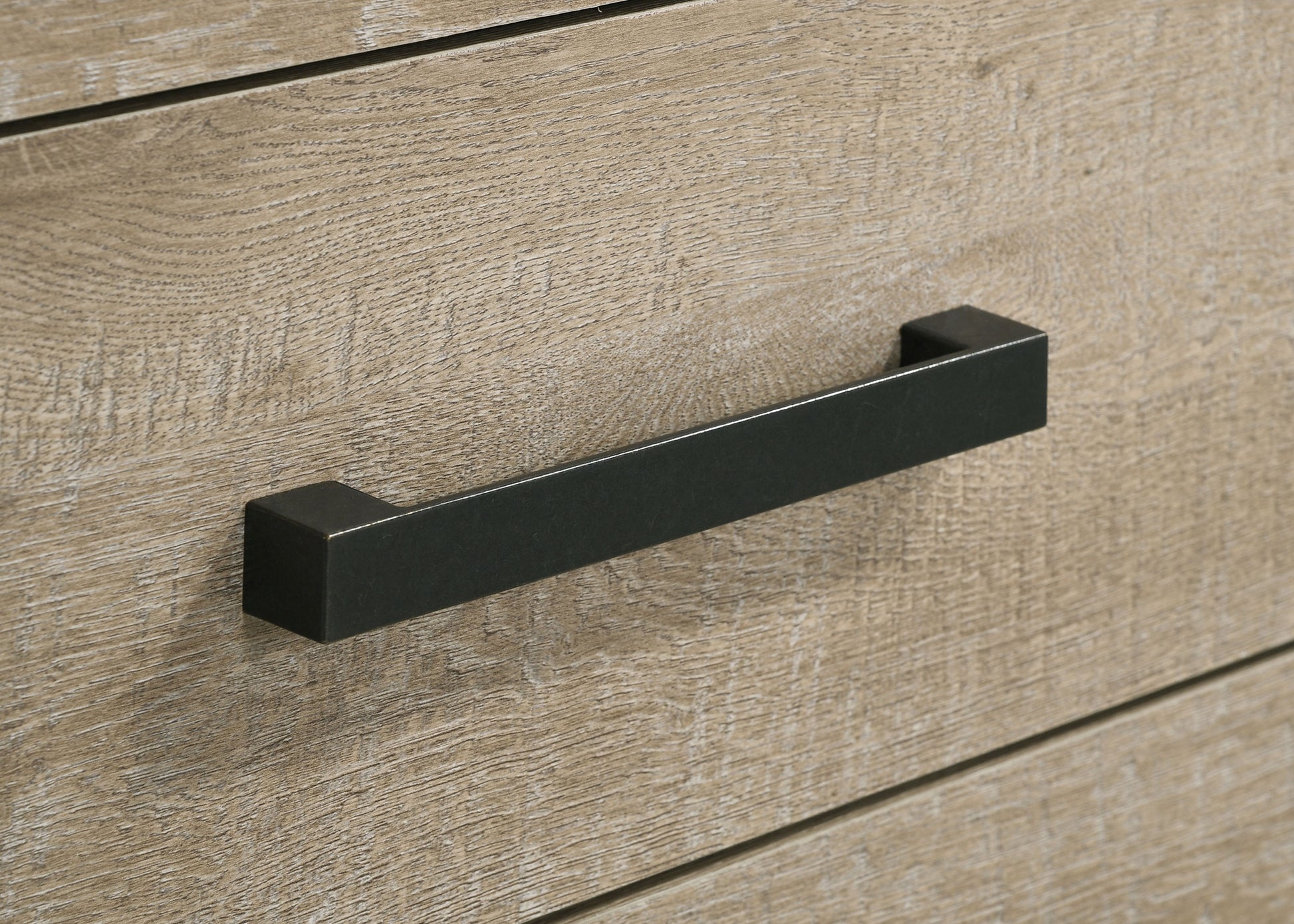 This six-drawer dresser offers a stylish blend of rustic charm and modern practicality. Featuring a weathered oak finish, it is crafted from engineered wood with a scratch-resistant veneer for long-lasting durability. Dark bronze handles provide bold contrast, while the smooth-gliding drawers offer ample space for clothing and essentials. Designed to bring warmth and elegance to your bedroom, its clean lines and generous storage make it a functional and decorative focal point for rustic or transitional interiors.