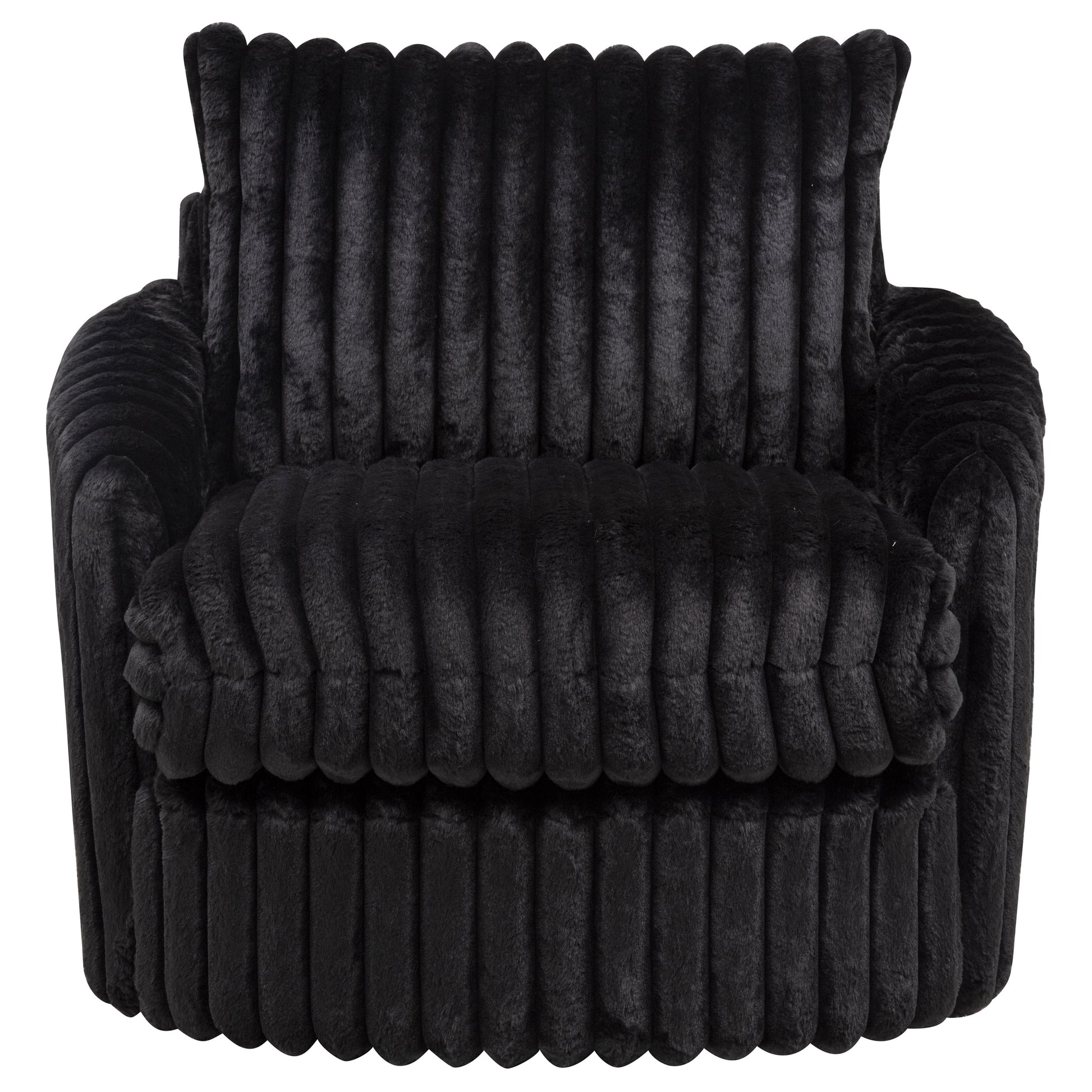 Contoured for comfort and wrapped in plush texture, this swivel chair invites relaxed movement with a soft, sculptural silhouette. Deep channel tufting traces every curve, from the wide seat to the tailored backrest and arms. Fully upholstered in ribbed corduroy and built with layered foam, this lounge chair rotates 360 degrees for flexible conversation. Ideal for modern living rooms, reading corners, or cozy bedrooms.