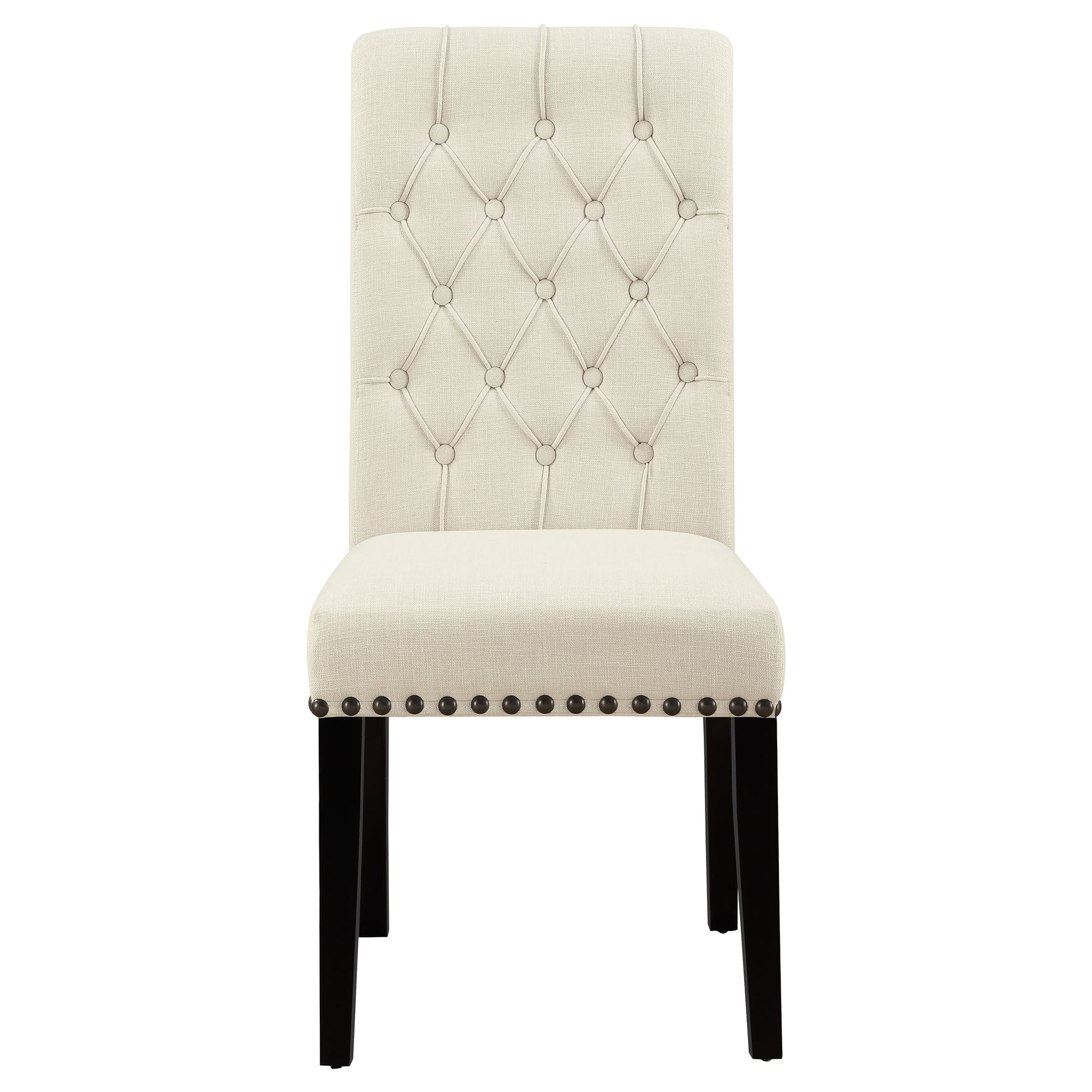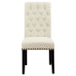 • Plushily padded side chairs are adorned with rolled backs and button-tufted upholstery with bold nailhead trim