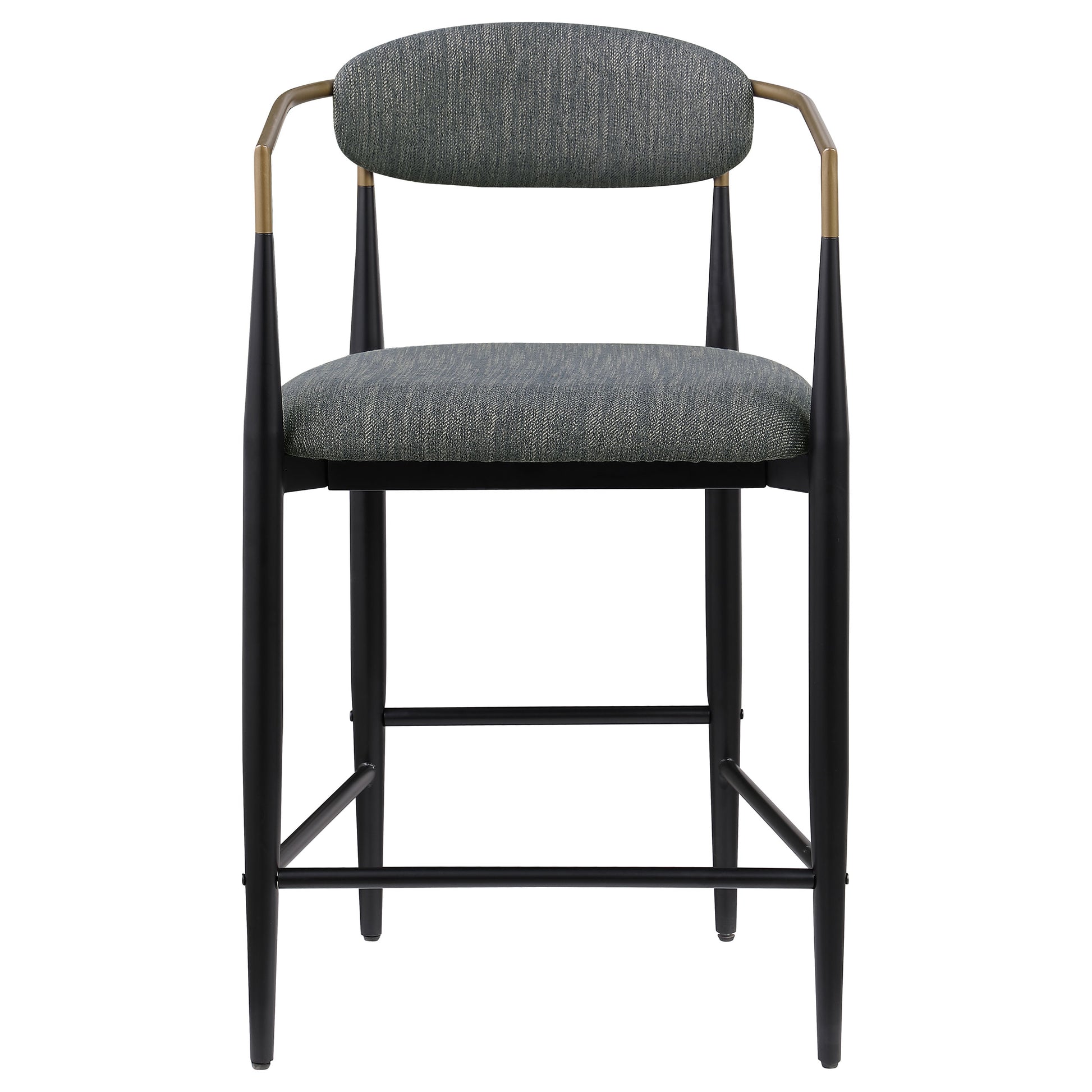 Charm is the watchword for a set of two modern counter height stools. Each embraces a light, airy ambiance with an open back and slim, rounded rest that provides ample support for everything from a leisurely meal to a quick bite. Its padded seat adds foam for comfort, while stylish upholstery sets the tone in your kitchen or dining room. The counter stool features a black finished base with a tapering silhouette that offers airy, open elegance. A built-in footrest is a perfect finishing touch, delivering impressive support to both the chair and those that sit upon it.